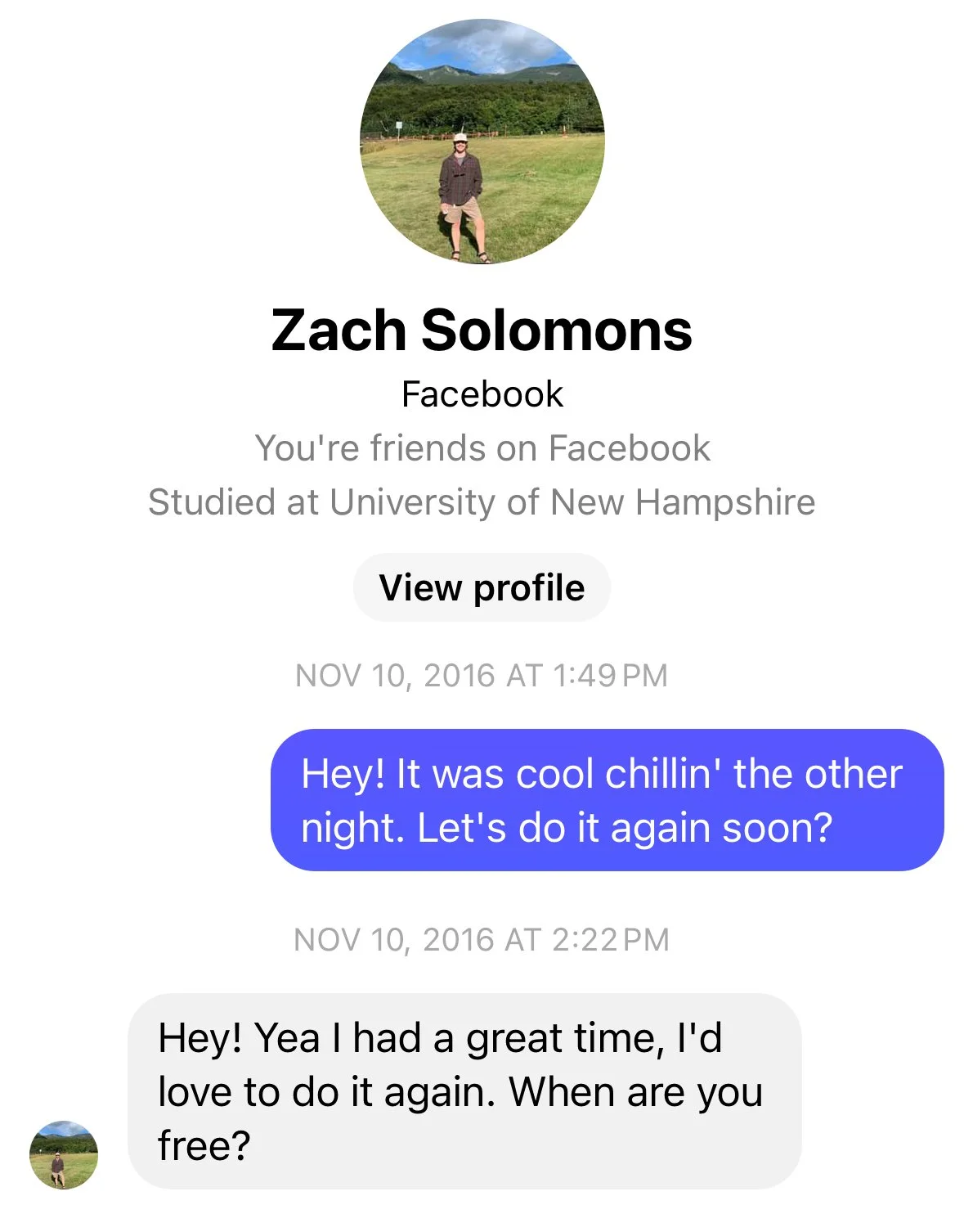It wasn't until a breezy fall night in 2016 that their paths finally crossed in a meaningful way. Surrounded by mutual friends, Rachel and Zach shared laughs and friendly banter, sparking a connection that would change everything. And it was Rachel's bold move of sending a Facebook message (see screenshot) after one too many cocktails at a company retreat that truly set their love story in motion (shout out Rach).